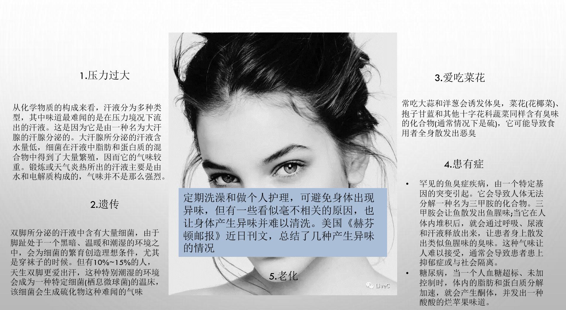 我们需要开发一系列的产品呵护老人的健康,如身体清洁类产品,开发抗“加龄臭”药皂。研究发现,含聚酚的混合提取物(乌龙茶、甜茶、绿茶、涩柿子的提取物)具有很高的抗氧化作用和消除2-壬烯醛臭气的效果。4周的人体试验也证实:含抗壬烯醛PC的肥皂可明显降低人体的2-壬烯醛量,因此能够有效防止“加龄臭”。同时添加可消除2-壬烯醛的清新因子“氨丁三醇”,效果明显。可用于洗去型产品如沐浴露,洗发香波,药皂,或者停留型的产品,如香体喷雾,香体走珠棒。也可用于衣服清洗剂和空气清新剂/清新凝胶。