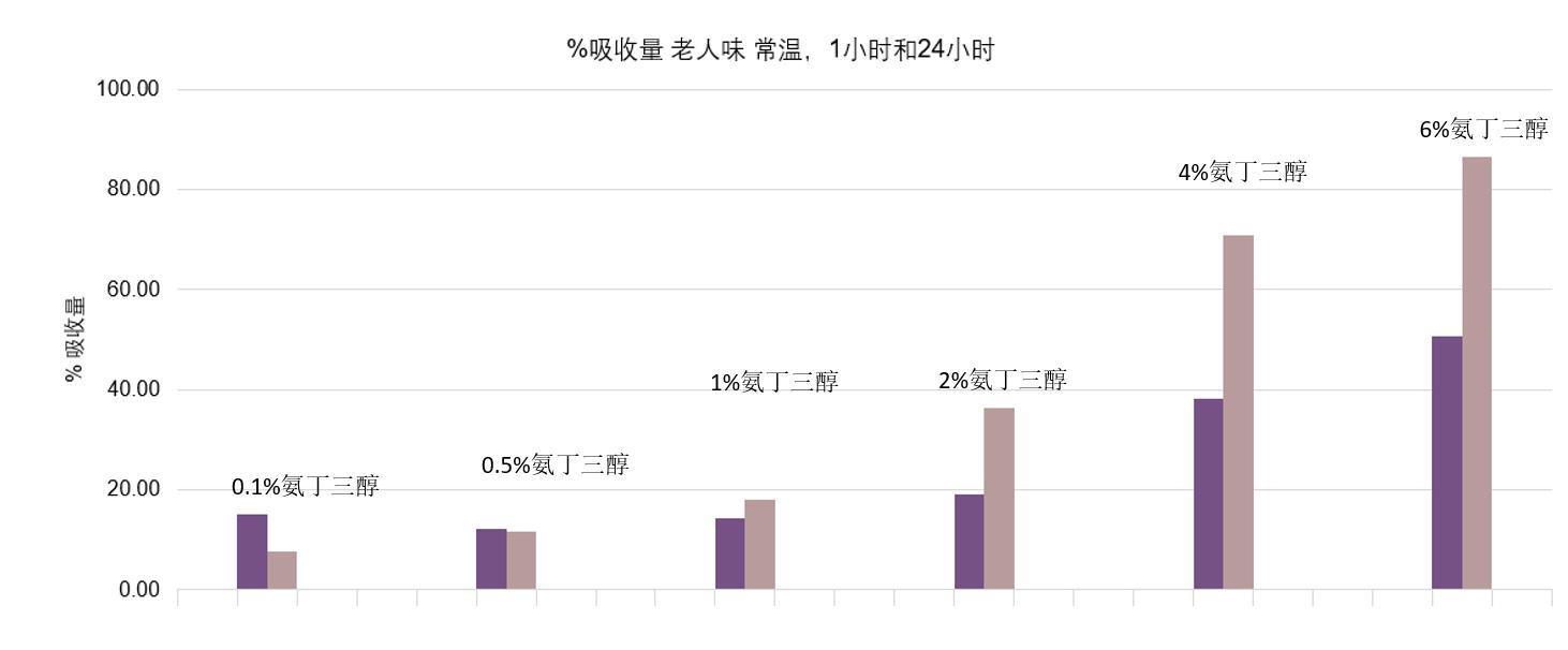 氨丁三醇是多功能氨基醇,可捕获醛和脂肪酸。与醛形成亚胺以及恶唑烷。6%的氨丁三醇可在24小时内吸收90%左右的老人味。配方中辅助抗氧化物以吸附成分如竹炭等,可达到95-99.9%的吸附量。