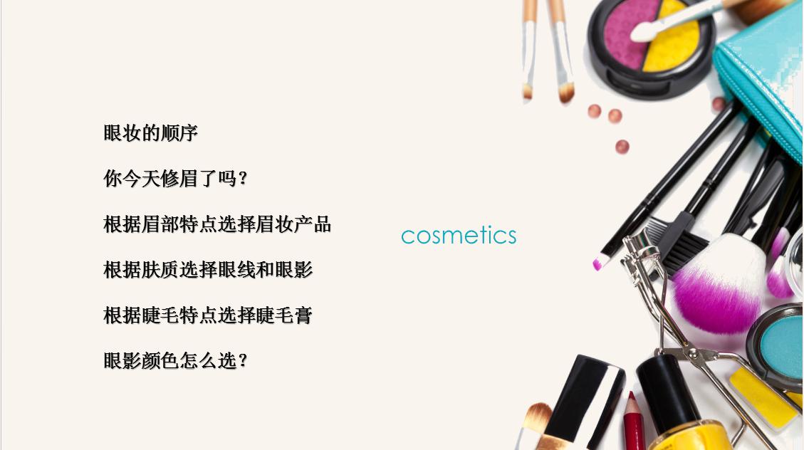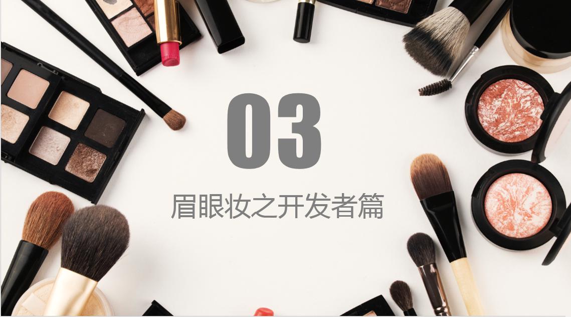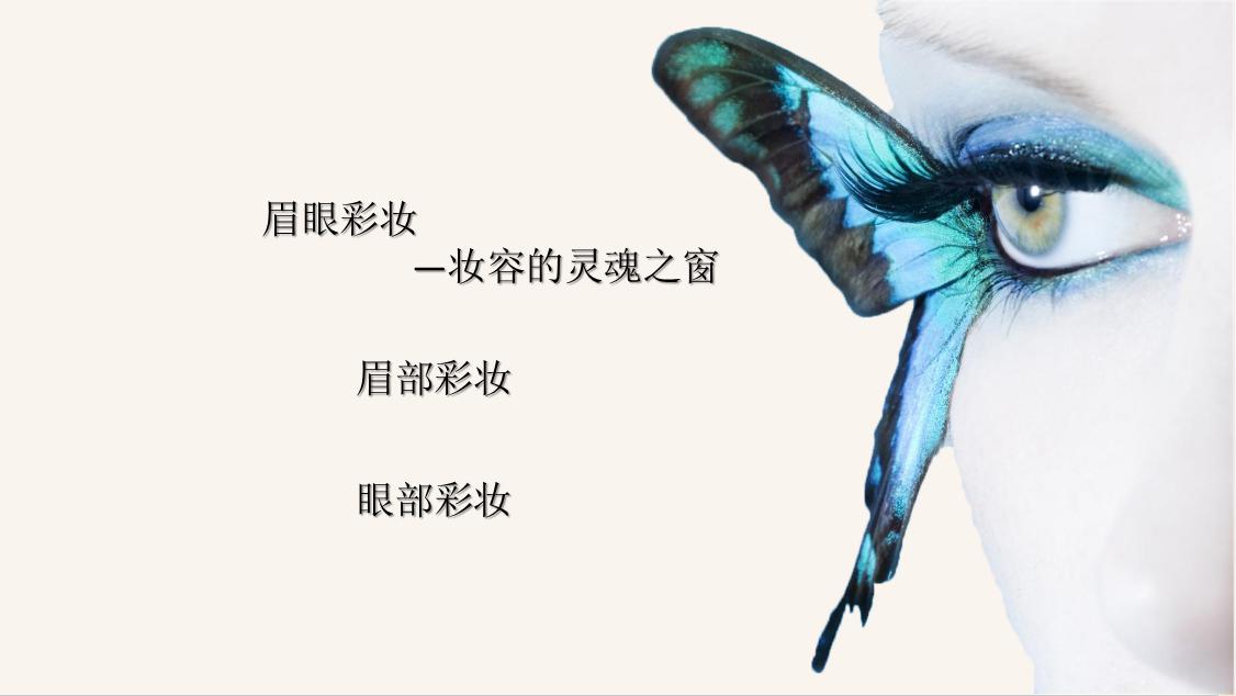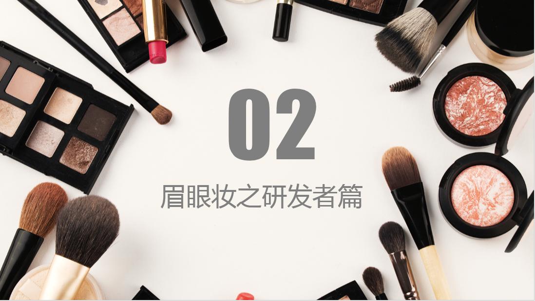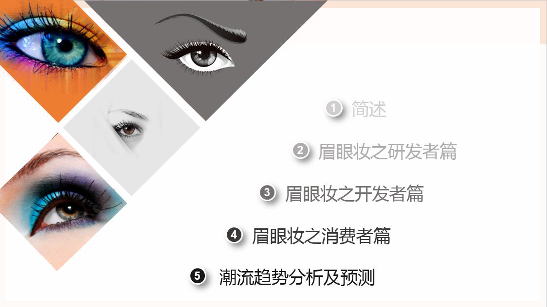 大家可以先看一下我们第一张PPT就是彩妆之眉眼妆产品,我们接下来看我们PPT的第二张就是同样我们今天分了简述:眉眼妆之研发者篇,眉眼妆之开发者篇,眉眼妆之消费者篇,最后是潮流趋势分析及预测。大家先看到我们第一个部分简述的部分,也就是我们的第四张PPT。右边是一个眼睛上带着蝴蝶,特别空灵的形象。什么是眉眼部分的彩妆?其实从字面意义上很简单,就是修饰我们眉部,眼部,眼周色彩,打造我们的眉形,眼部轮廓的彩妆产品。