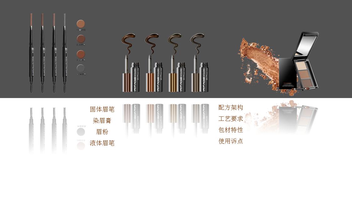 接下来我们会根据我们讲的眉眼部产品的基本上几个大类,眉妆类的产品,然后睫毛膏、眼线和眼影四个部分来讲一下。每一个部分我们都会一个例子来基本讲一下我们的配方架构、工艺要求、包材特性和使用诉点。