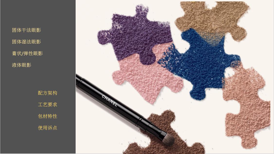 接下是我们研发者篇配方架构的最后一个部分,眼影类。眼影类的话,同样常规的就是我们固体眼影,固体眼影根据我们工艺上的不一样,分为干法和湿法。其他两种比较不常规的就是我们膏状或者是说弹性饼的眼影,另外就是我们的液体眼影。