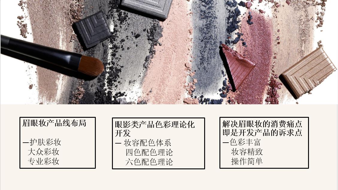 同样的,像我们前面讲的底妆和唇妆都讲到了眉眼妆产品线的布局,针对于护肤彩妆和大众彩妆,还有专业彩妆,我们做怎样的开发初衷和延伸。那么眼妆,特别是我们色彩变化最多的眼影类的这部分产品,我们在开发眼影类产品的时候,我们在配色上面是做如何开发依据。比如说我们要开发四色眼影或者六色眼影,我们的配色理论是什么?最后一个部分,我们其实开发眉眼部妆眉眼妆产品的目的是为了给消费者用我们解决眉眼妆的消费,痛点其实就是开发产品的诉求点,基本上就是色彩丰富,妆容精致,但是操作简单。
