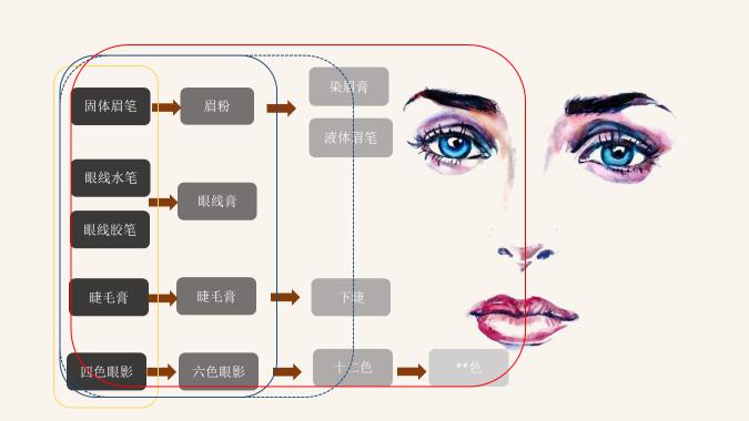 从上图中可以看到,基本上我们一样也是按照类别来分,首先最黑色的这一个部分就是我们的固体眉笔,眼线水笔,眼线胶笔睫毛膏和四色眼影。固体眉笔延伸到眉粉,最后延伸到我们的染眉膏和液体眉笔。眼线水笔和眼线胶笔有时候是并存的,最后延伸到我们的隐性高睫毛膏。为什么延伸后面也有睫毛膏,因为睫毛膏它有类别,你是浓密的,纤长的卷翘的,最后延伸到我们细节部分,我做个例子,比如说针对于我们下睫毛的睫毛膏,最后四色眼影可能延伸到六色眼影12色,后面我没有具体写,可能24色48色。