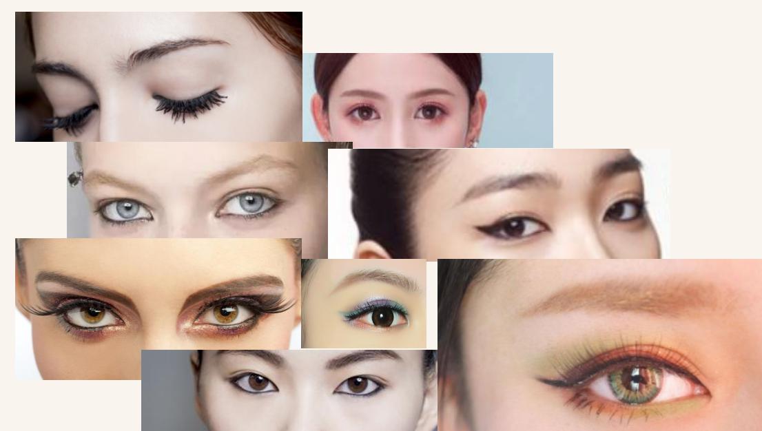 大家来看我们趋势和分享这张PPT其实不管是从今年的纽约时装周,然后上海的时装周,还有我们其他各大一线品牌,在眉眼妆部分发布的妆容的定位上面都可以看出。我们基本上在19年呈现眉眼妆的一个趋势,就是两极化,要么就是极其自然的,要么就是色彩特别复杂的。而欧美的趋向在眼型修饰上,他们的趋势其实开始开始像我们亚洲人的眼型潮流开始做流行了。大家看到我们左边第二张图,从我们眼球的颜色,我们可以看到这个明显是一个欧美人的脸,这是一个一线彩妆品牌,明年的眼妆的妆容趋势。大家看到左边最下面的眼形,明显这是我们一个亚洲人的眼形,对吧?大家有没有发现这两个眼型?这两个眼型,一个是比较相似,在一个在勾勒的方法上面。特别一致,强调我们本身眼睛的形状,从我们前两年的眼型,我们要追求大而圆,我们看到我们右上角的这张图,其实就是我们韩系妆容的图,前几年我们都是流行我们这种韩系妆容的眼睛要大眼头要开,而回归到勾勒我们本身亚洲人本身的眼型,就是偏细长,眼头自然往下,然后眼尾的话是自然回收,而不像原来我们要刻意用眼线在眼尾勾一个向上的一个尖角。而在眼影的选择上面,其实更多是为了凸显我们本身亚洲人所有的这种前短前窄后宽的比较窄比较薄的这种双眼皮,甚至是单眼皮,而不刻意用眼线或者是眼影,营造出一个假的大的欧式双眼皮的这种效果。